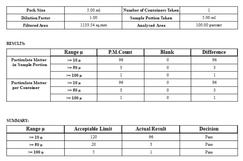 To verify the presence of visible particles in injectable drugs, it’s advisable to visually examine the cloudy solution by diluting it with a clear diluent. This process helps clear the cloudiness of the solution, making the particles visible. Furthermore, to confirm the existence of particles larger than 100 micrometers (µ), you can also perform a particulate matter count following the USP 788 standard. The below report is for reference to interpret the study