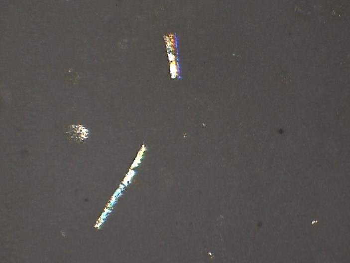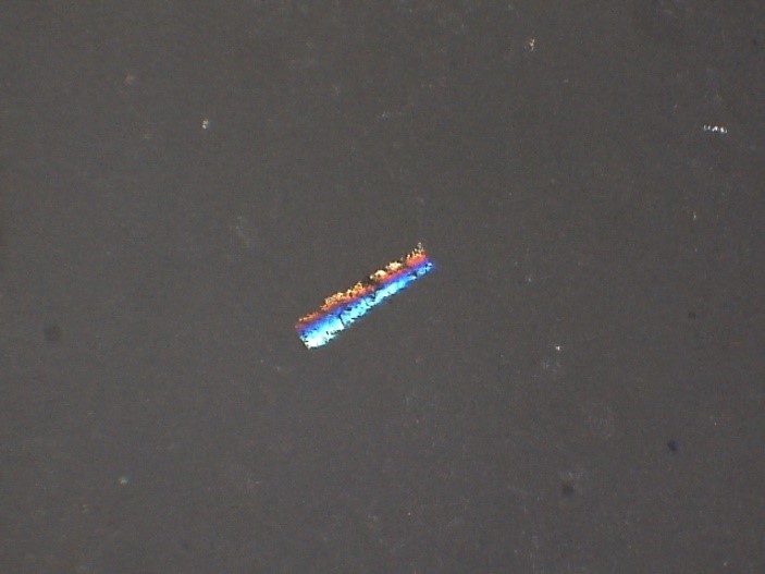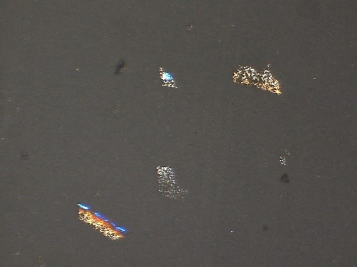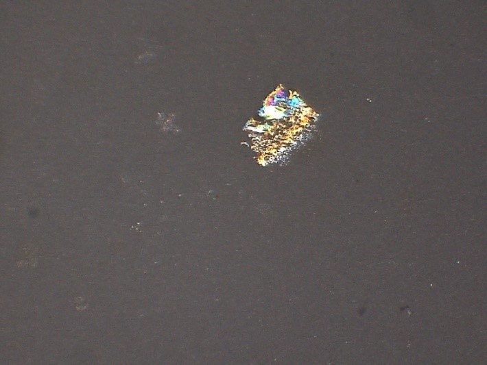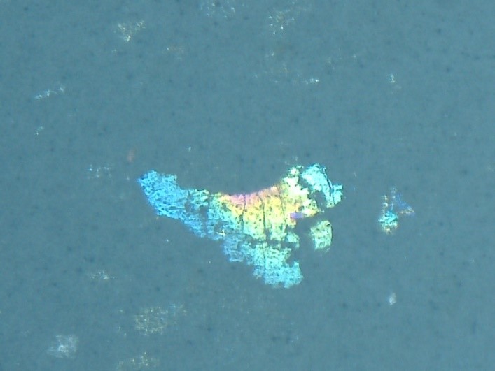 Initially, vials are examined visually using a fiber optic light. The very thin flakes produce a twinkling effect that is characteristic of glass delamination. The vials are then examined using a stereomicroscope to confirm the presence of thin flakes in solution. In order to isolate the flakes, the contents of the vials are filtered using membrane filters. The filters are then examined using a low magnification stereomicroscope using several different lighting conditions including coaxial illumination and oblique illumination, or a combination of both. Coaxial light is also referred to as episcopic light. This type of lighting is optimal for observation of thin particles, residues and films, as well as surface features. Glass delamination flakes are extremely thin and thus are usually only visible using coaxial/episcopic illumination. If present, glass delamination is in the form of very thin, sharp-edged, irregular flakes. The flakes range in color from brown for extremely thin flakes to red and blue for thicker flakes. A photomicrograph of typical glass delamination flakes is shown in Figure below observed under stereo-microscope on filter paper: